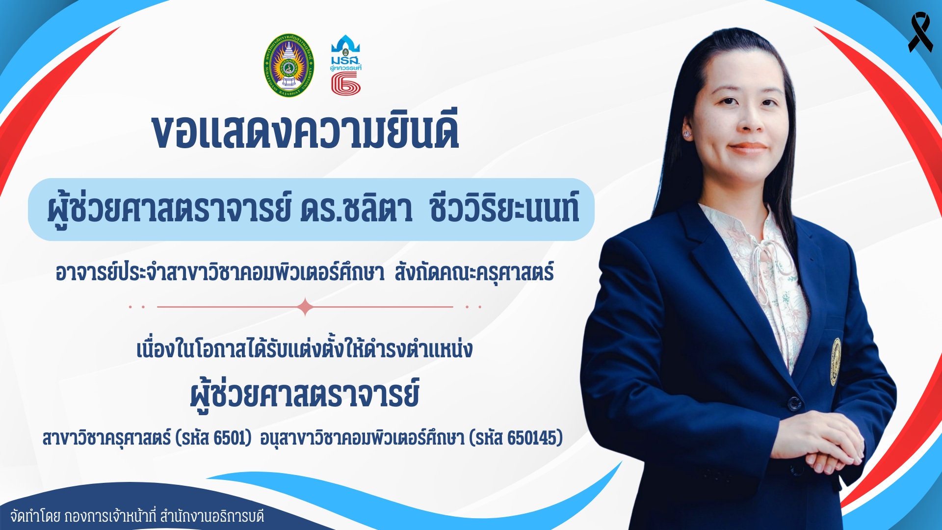- นางสาวชลิตา ชีววิริยะนนท์ พนักงานมหาวิทยาลัย สังกัดคณะครุศาสตร์ ได้รับอนุมัติแต่งตั้งให้ดำรงตำแหน่งผู้ช่วยศาสตราจารย์ สาขาวิชาครุศาสตร์ (รหัส 6501) อนุสาขาวิชาคอมพิวเตอร์ศึกษา (รหัส 650145)