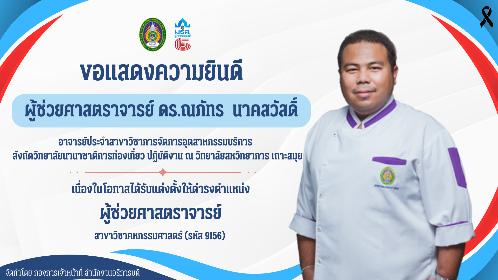 ขอแสดงความยินดีกับผู้ได้รับการแต่งตั้งให้ดำรงตำแหน่งวิชาการ โดยมติสภามหาวิทยาลัยราชภัฏสุราษฎร์ธานี ในการประชุมเมื่อวันที่ 23 ธันวาคม 2568