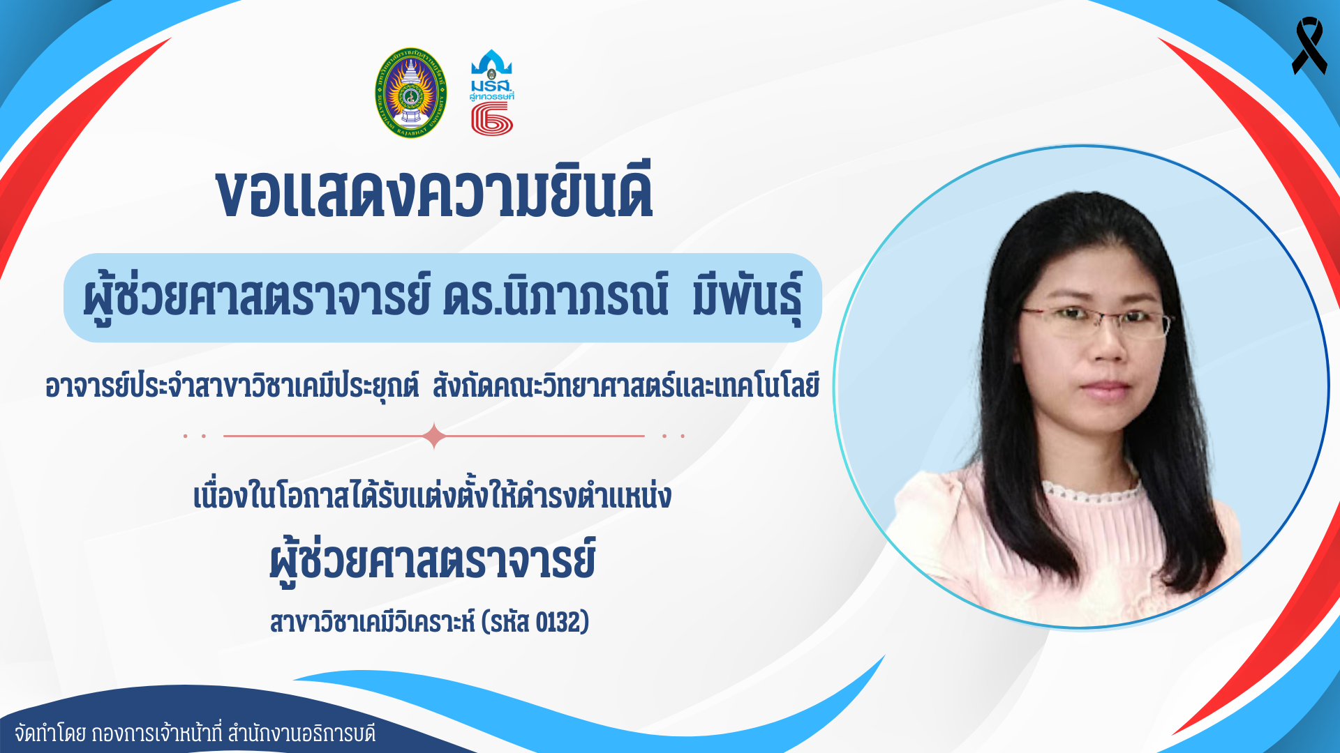 - นางสาวนิภาภรณ์ มีพันธุ์ พนักงานมหาวิทยาลัย สังกัดคณะวิทยาศาสตร์และเทคโนโลยี ได้รับอนุมัติแต่งตั้งให้ดำรงตำแหน่งผู้ช่วยศาสตราจารย์ สาขาวิชาเคมีวิเคราะห์ (รหัส 0132)