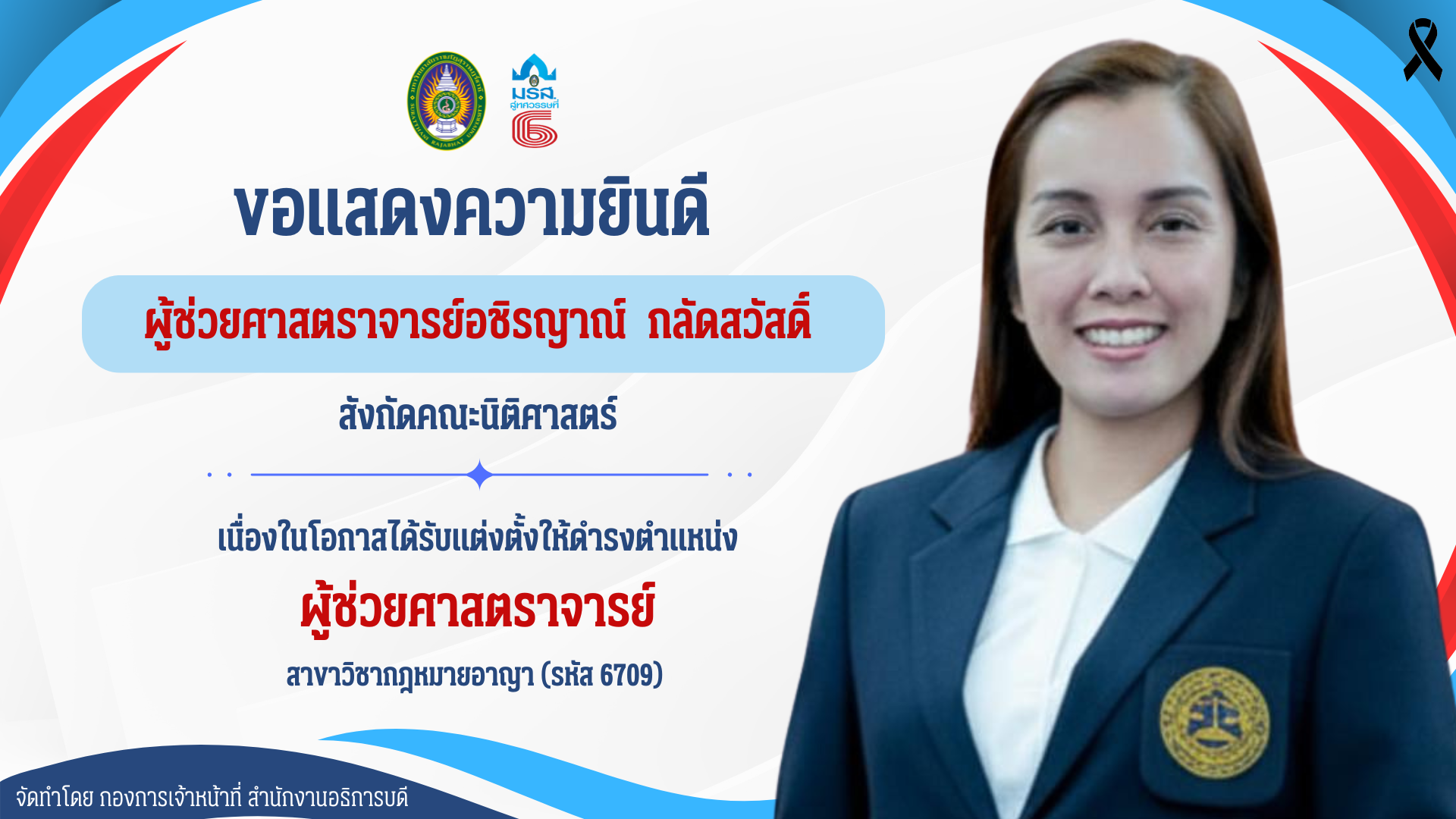 - นางสาวอชิรญาณ์ กลัดสวัสดิ์ พนักงานมหาวิทยาลัย สังกัดคณะนิติศาสตร์ ได้รับอนุมัติแต่งตั้งให้ดำรงตำแหน่งผู้ช่วยศาสตราจารย์ สาขาวิชากฎหมายอาญา (รหัส 6709)