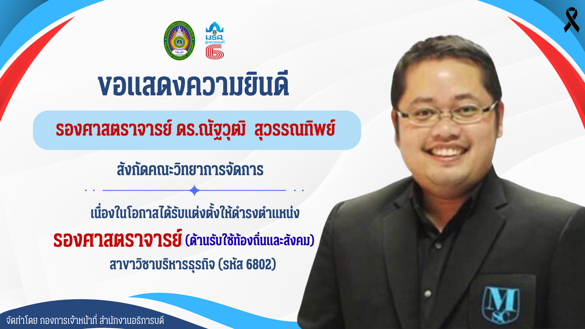 - นายณัฐวุฒิ สุวรรณทิพย์ พนักงานมหาวิทยาลัย สังกัดคณะวิทยาการจัดการ ได้รับอนุมัติแต่งตั้งให้ดำรงตำแหน่งรองศาสตราจารย์ (ด้านรับใช้ท้องถิ่นและสังคม) สาขาวิชาบริหารธุรกิจ (รหัส 6802)