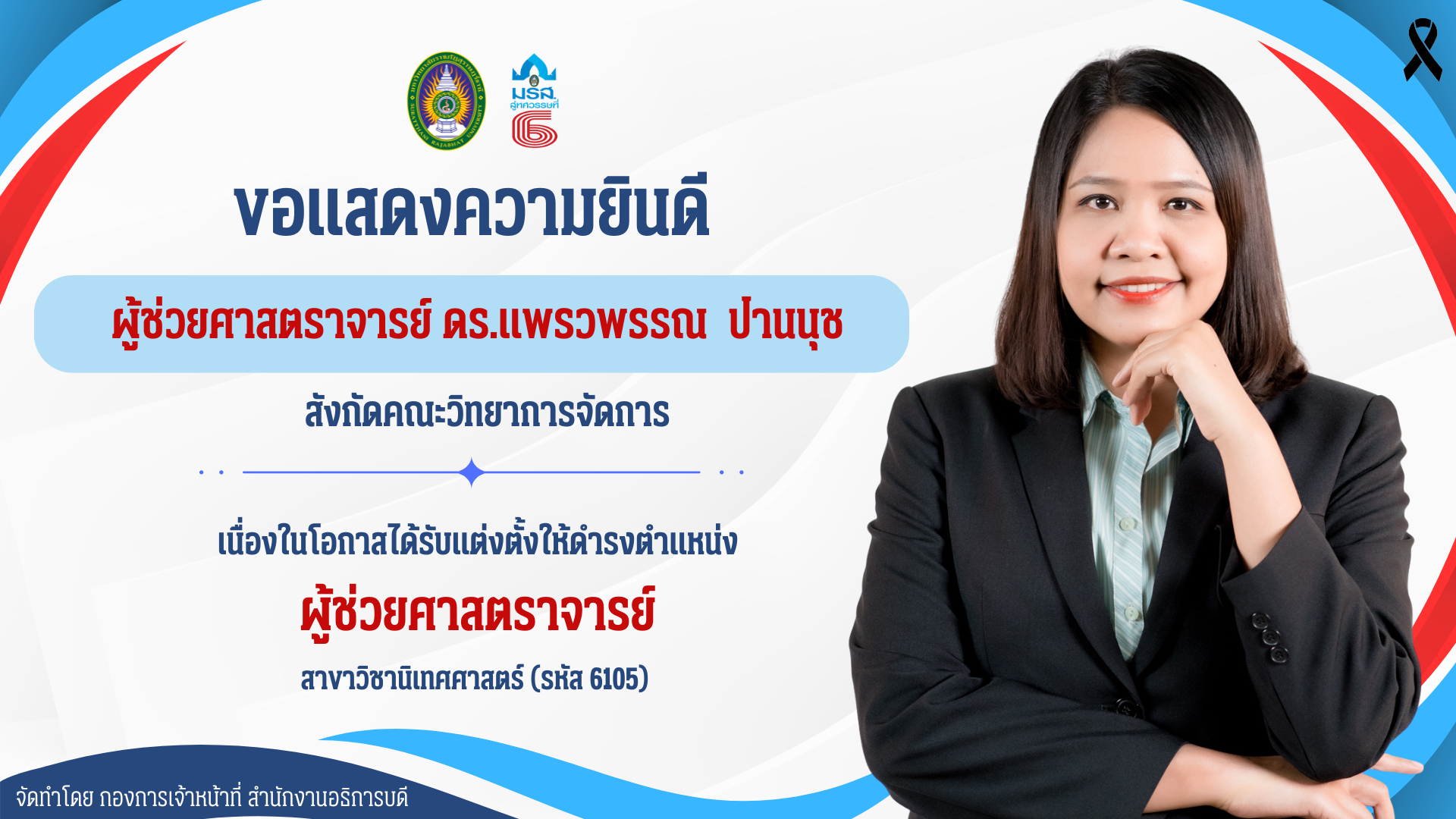 - นางสาวแพรวพรรณ ปานนุช พนักงานมหาวิทยาลัย สังกัดคณะวิทยาการจัดการ ได้รับอนุมัติแต่งตั้งให้ดำรงตำแหน่งผู้ช่วยศาสตราจารย์ สาขาวิชานิเทศศาสตร์ (รหัส 6105)