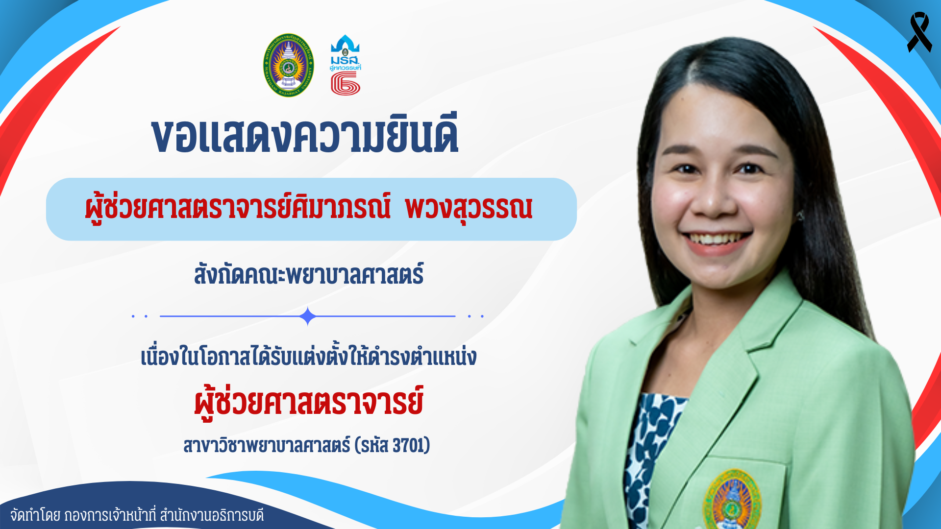 - นางสาวศิมาภรณ์ พวงสุวรรณ พนักงานมหาวิทยาลัย สังกัดคณะพยาบาลศาสตร์ ได้รับอนุมัติแต่งตั้งให้ดำรงตำแหน่งผู้ช่วยศาสตราจารย์ สาขาวิชาพยาบาลศาสตร์ (รหัส 3701)