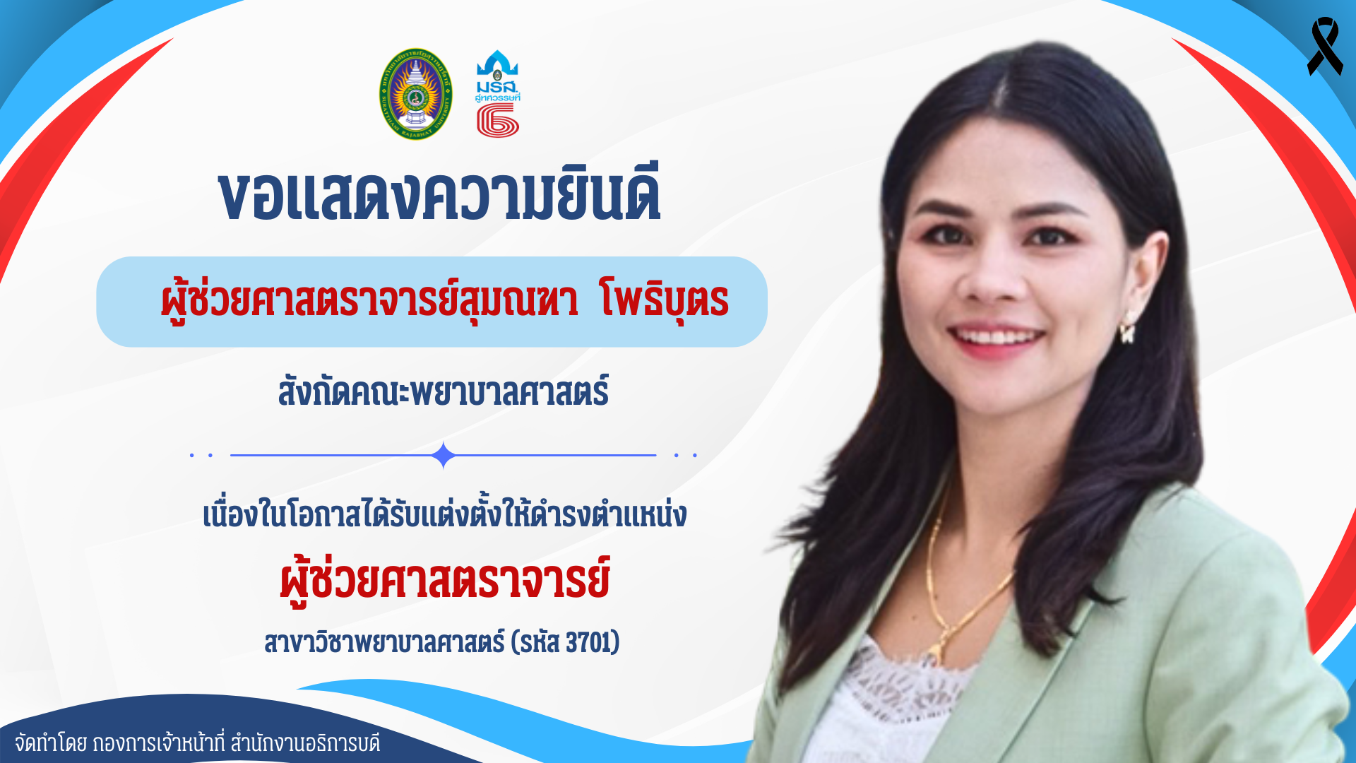 - นางสาวสุมณฑา โพธิบุตร พนักงานมหาวิทยาลัย สังกัดคณะพยาบาลศาสตร์ ได้รับอนุมัติแต่งตั้งให้ดำรงตำแหน่งผู้ช่วยศาสตราจารย์ สาขาวิชาพยาบาลศาสตร์ (รหัส 3701)
