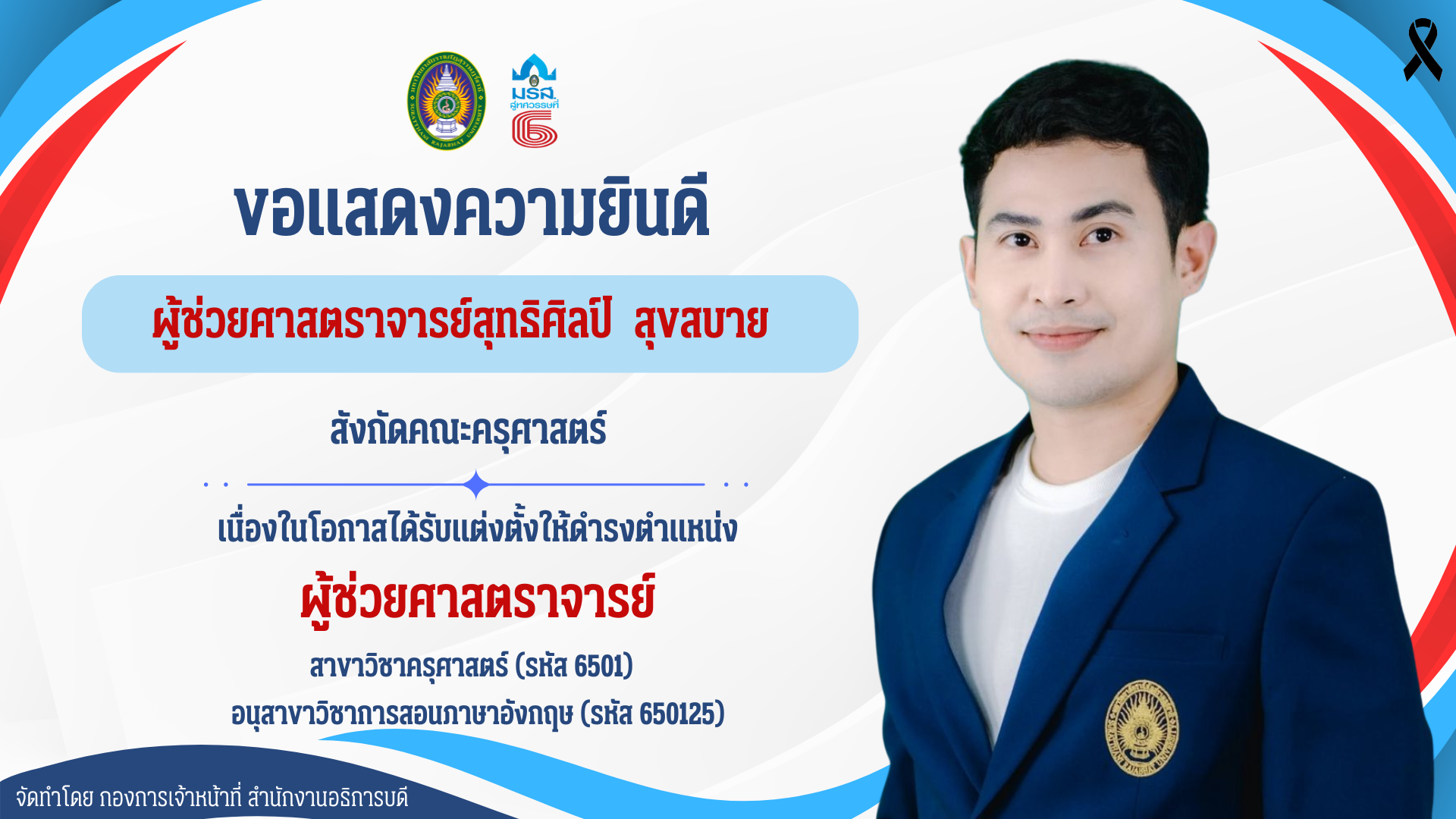 - นายสุทธิศิลป์ สุขสบาย พนักงานมหาวิทยาลัย สังกัดคณะครุศาสตร์ ได้รับอนุมัติแต่งตั้งให้ดำรงตำแหน่งผู้ช่วยศาสตราจารย์ สาขาวิชาครุศาสตร์ (รหัส 6501) อนุสาขาวิชาการสอนภาษาอังกฤษ (รหัส 650125)
